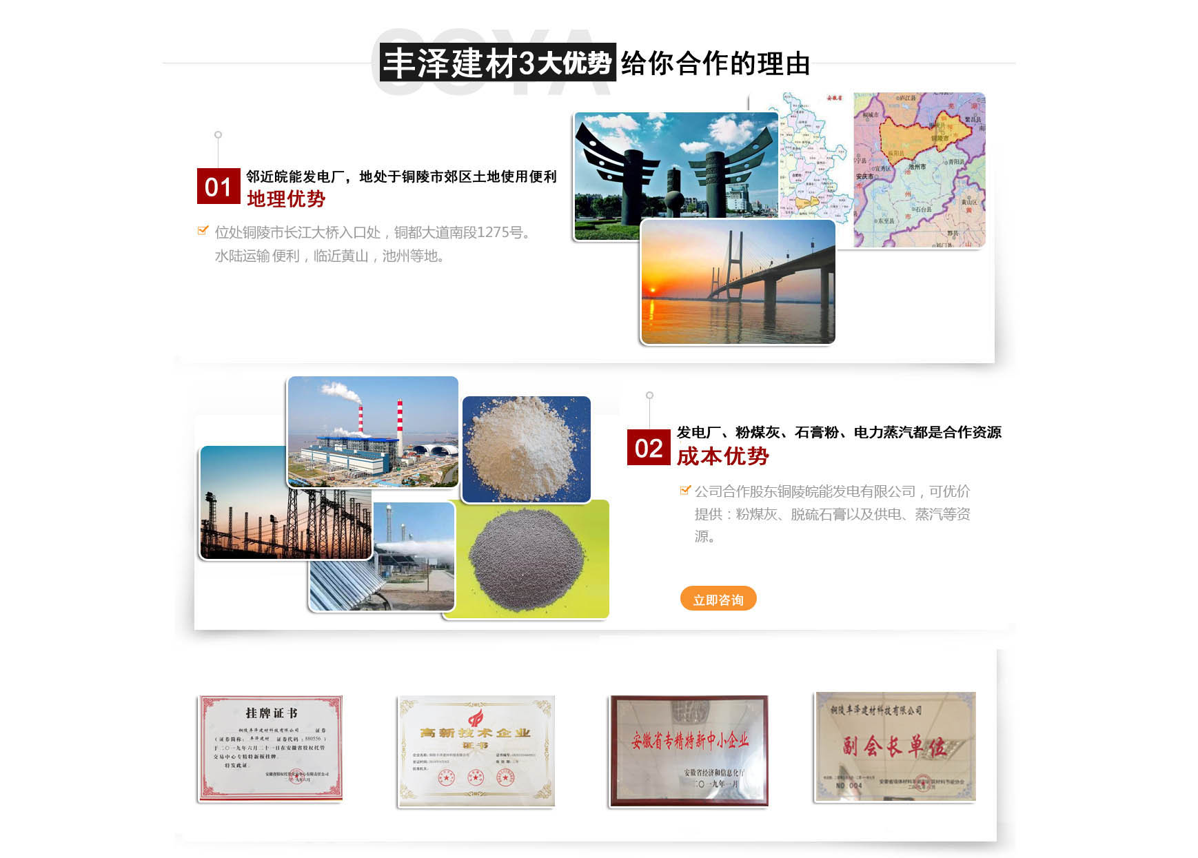 銅陵豐澤建材科技有限公司成立于2007年2月,坐落于銅都大道南段,占地4萬(wàn)平方米,公司注冊(cè)資金1000萬(wàn)元,現(xiàn)有職工百余人,是一家與皖能發(fā)電公司合作,專(zhuān)業(yè)從事電廠粉煤灰開(kāi)發(fā)利用的高新科技企業(yè),現(xiàn)擁有一條年產(chǎn)30萬(wàn)立方米蒸壓加氣混凝土全自動(dòng)生產(chǎn)線(xiàn)。 蒸壓加氣混領(lǐng)土(英文名Autoclaved aerated comcrete),也稱(chēng)AAC,是以砂、粉煤灰等硅質(zhì)材料和石灰、水泥等鈣質(zhì)材料為主要原料,摻加鋁粉為發(fā)氣劑,進(jìn)行生產(chǎn)的新型墻體材料。是我國(guó)推廣應(yīng)用最早,使用最廣泛,技術(shù)最完整的輕質(zhì)保溫墻體材料之一,自問(wèn)世以來(lái),始終方興未艾,備受推崇。